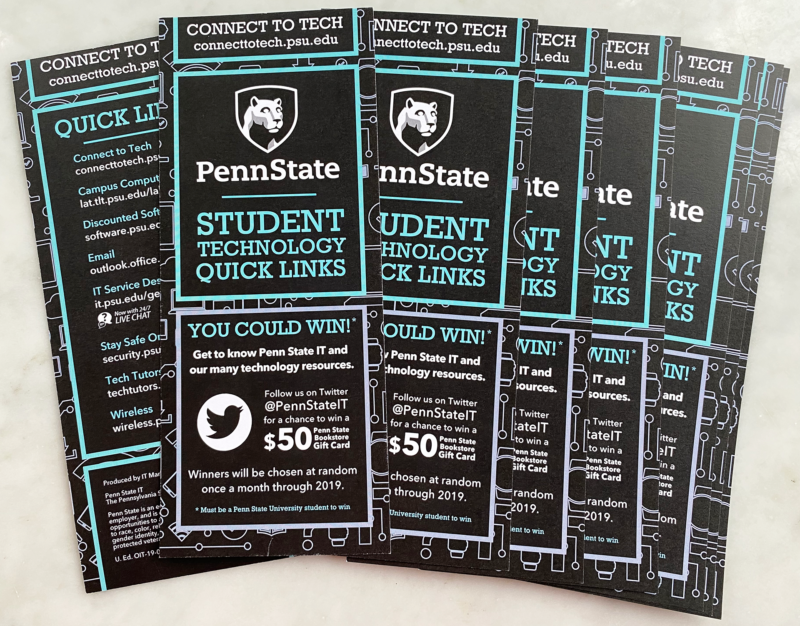 We script and design a 20-minute “Get Connected” presentation as part of the two-day orientation tour. For University Park, we even hire and train the student presenters. In addition, each student receives a Connect to Tech guide that directs them to the Connect to Tech website for more information. At the end of NSO, 90% of polled students agreed they were now aware of technology services and help. We continue to handout collateral at events like the Libray Open House, Altoona Tech Fair, and Graduate Student Orientation.